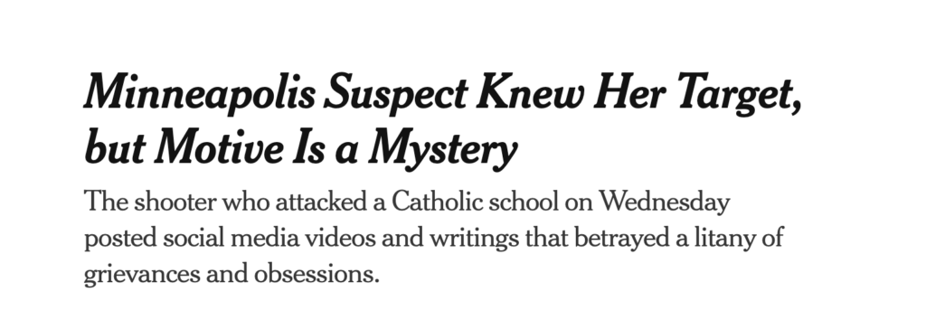 And Ms. Westman, armed with three weapons, seemed to choose the time carefully. She barricaded the doors during the first all-school Mass of the academic year, the police said. But it is hard to fathom what drove Ms. Westman to attack before killing herself, despite the dark and violent writings and videos she left behind. The attack killed an 8-year-old and a 10-year-old in the pews and injured 17 others, according to the Minneapolis police chief, Brian O’Hara. The three weapons were purchased legally, police officials said.