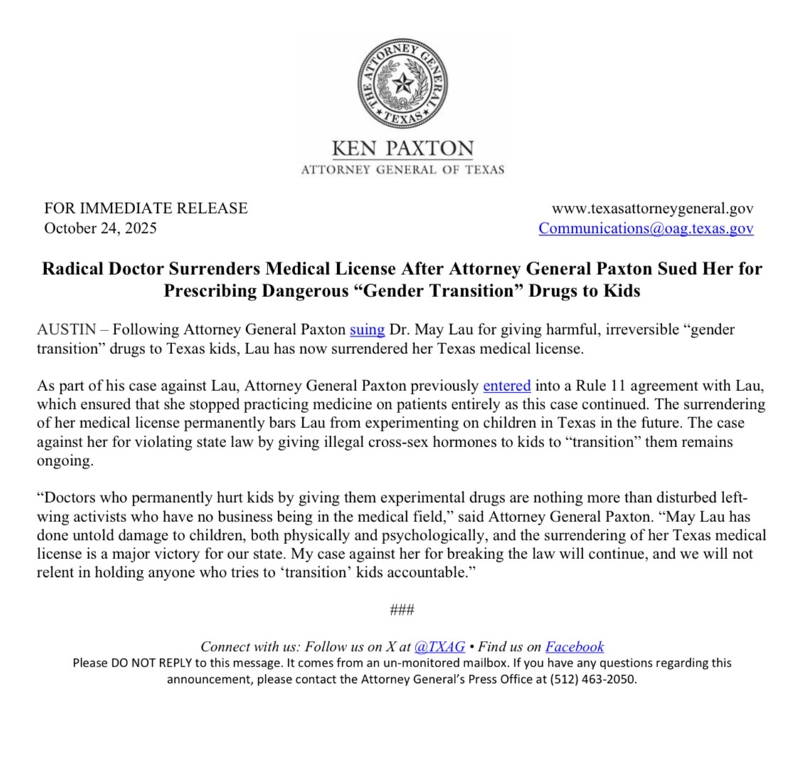 — Attorney General Ken Paxton (@KenPaxtonTX) October 24, 2025