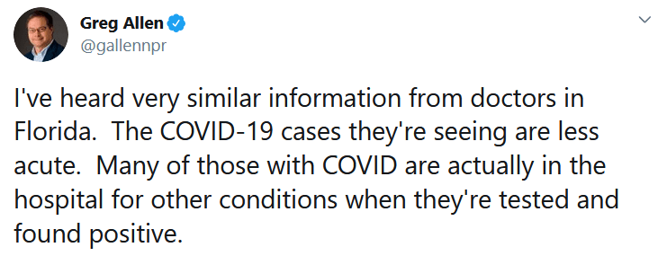 External Link NPR Reporter: Florida Coronavirus ‘Surge’ Wildly Over-exagerrated "large increases in positive tests, smaller but real increases in Covid-positive admissions and ICU care, but almost no increase in overall admissions"