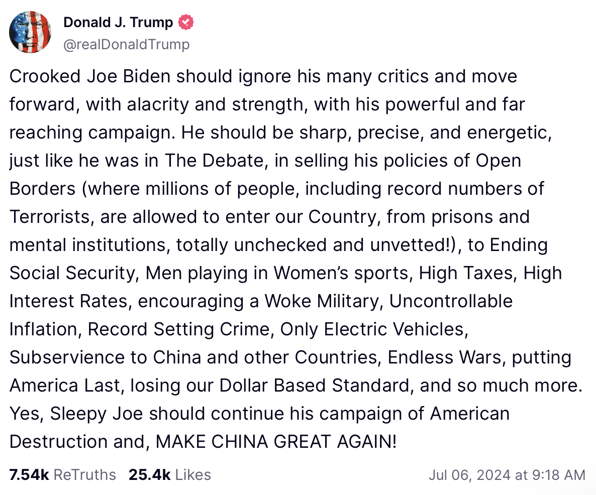 External Link Trump: ‘Crooked Joe Biden should ignore his many critics and move forward, with alacrity and strength…’
